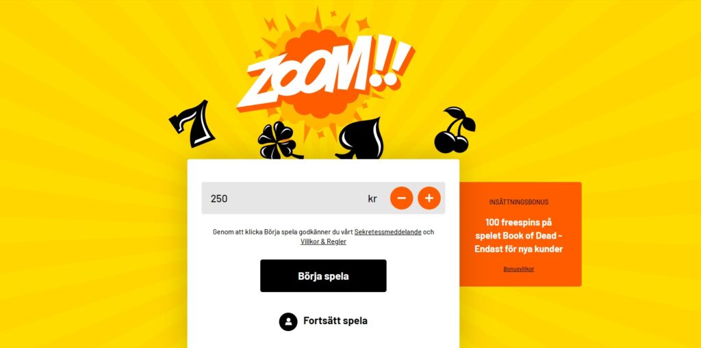 Sajten är mycket enkel och fokus ligger på att spelare snabbt ska komma igång. Eftersom Kazoom är ett casino utan konto behöver du bara ange det belopp du vill spela för och bekräfta med ditt personliga BankID för att börja spela.