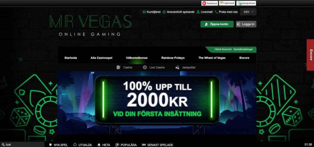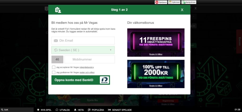 Mr Vegas, som har en svensk spellicens, följer självklart regeringens regler och erbjuder nya spelare en generös välkomstbonus på 100% upp till 2000 kr. Omsättningskravet för bonusen är 35x insatsen.